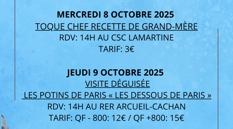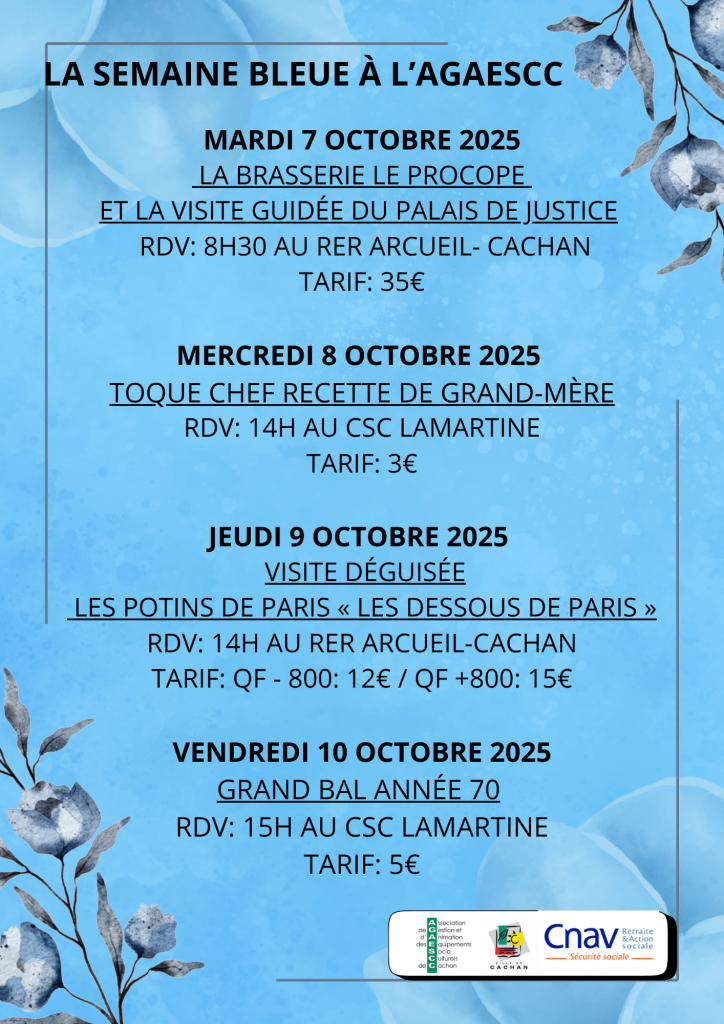 Actualités Actualités CSC Cousté Actualités CSC La Plaine Actualités CSC Lamartine Culture Seniors SEMAINE BLEUE DES SENIORS 2025 septembre 15, 2025septembre 15, 2025 Kevin ATTARD 2025, cachan, centres socioculturels, Csc Lamartine, Csc Laplaine, Culture, maison cousté, semaine bleue, senior, Seniors, sortie, sorties Inscription dans les trois centres socioculturels de Cachan. Venez nombreux !!!